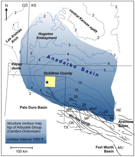 - Johnson, K.S. (Ed.) Geological evolution of the Anadarko basin. In Anadarko Basin Symposium, Oklahoma Geological Survey Circular; Johnson, K.S. (Ed.) Oklahoma Geological Survey : Toulsa, OK, USA, 1988; Volume 90, pp. 3–12. [Google Scholar]