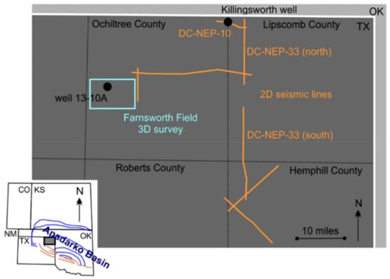 Overview map of Farnsworth Field study site within Ochiltree County, seismic lines and well data used in this study, and locations of 2D seismic lines and 3D seismic survey. The inset shows the location (grey) of the map. The Killingsworth well has been used for the well-tie with DC-NEP-10. Well 13-10A is a CO2 injection well in Farnsworth Field.