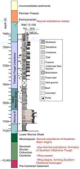 Subsequently, a phase of thermal subsidence occurred that led to the deposition of alternating carbonates, shales and sandstones in the Southern Oklahoma Trough [27]. These are the Arbuckle and Ellenburger Groups, deposited during the Middle Cambrian-Early Ordovician, mainly consisting of carbonates (Figure 3). The Simpson Group with sandy carbonates and clastic rocks was deposited in the Middle Ordovician, followed by the Late Ordovician Viola limestone and the Sylvan shale. The Silurian-Devonian Hunton Group mainly consists of shale and limestone; the Late Devonian- Early Mississippian Woodford Shale Formation overlays this group (Figure 3) [17,27,28,29,30,31,32,33,34,35]. Finally, the Woodford Shale was deposited; this is one of the source rocks for the Morrow B reservoir.