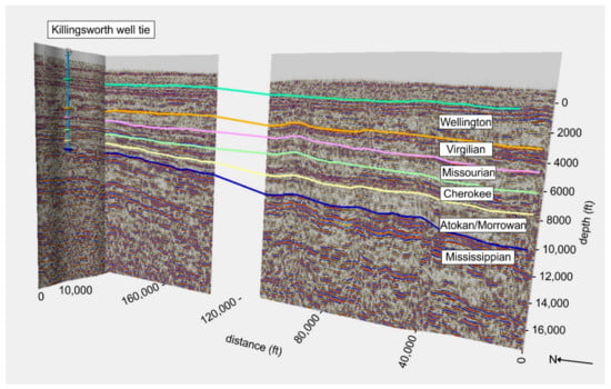 Formations generally dip southeastward in our study area, which is in agreement with regional trends [22,61,62]. The dip increases with stratigraphic age and units tend to thicken toward the deep basin. The Atokan and Morrowan formations are continuous, relatively transparent seismically, and cannot be resolved individually on these low-resolution lines. The top Mississippian is interpreted as an angular erosional unconformity, formed as a result of the Wichita orogeny [24]. There are no indications for faulting or seismic chimneys in both the east–west and north–south lines in the Atokan and Morrowan formations.