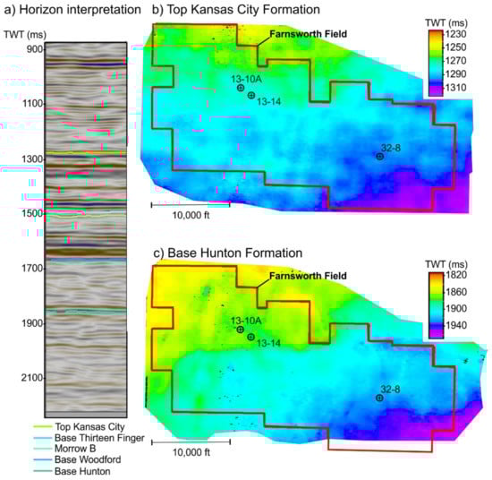 Interpreted horizons at location of well 13-10A (a); Top Kansas City Formation (b); and Base Hunton Formation (c). Farnsworth Field is outlined in red; also shown are locations of wells 13-10A, 13-14, and 32-8. Based on well ties, the “Morrow B reflector” is located within the Morrow B.