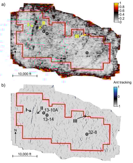 The Morrow B surface displaying the three characterization wells 13-10A, 13-14, and 32-8; (a) the Variance attribute overlain on the Morrow B surface; and (b) the Ant Tracking attribute overlain on the Ant Tracking volume. Features discussed in text are labeled as I, II, and III. In (a), the concentric rings in the eastern side of the survey have not been identified in other attributes and there is no evidence that they are geologic features.