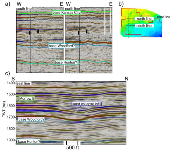 (a) Two seismic lines through the feature (labeled I and II in Figure 6) in the western part of Farnsworth Field; locations of lines indicated in (b); (b) portion of Farnsworth Field (outlined in red) and locations of seismic lines; (c) karst collapse infill structure in the eastern part of Farnsworth Field; location of east line indicated in (b). Vertical lines in (a) mark the dashed line in (b).