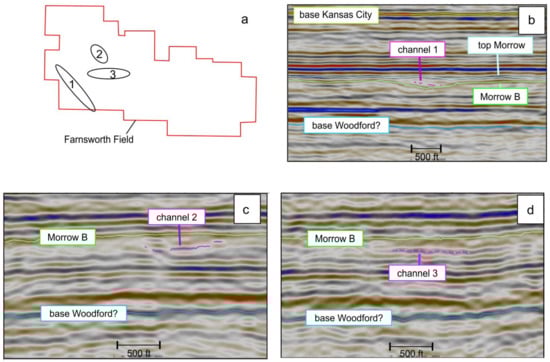 (a) Location of three channel-like features in the western Farnsworth Field; (b) details of seismic line intersecting channel 1; (c) details of seismic line intersecting channel 2; (d) details of seismic line intersecting feature 3.