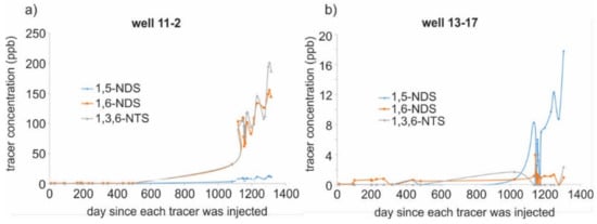 (a) Returns to well 11-2 of tracers 1,6-nds, 1,3,6-nts, and 1,5-nds that were injected into wells 13-13, 13-10A, and 13-5, respectively, on 2 May 2014; (b) returns to well 13-17 of the tracer 1,5-nds that was injected into well 13-5 during the 2014 tracing campaign.