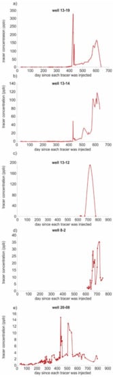 On 13 October 2015, 100 kg of 2,7-nds was mixed with water and injected as a slug into water-injection well 14-1. Surrounding production wells were sampled and analyzed over the subsequent 2.5 years. Figure 10 shows the return curves for the wells that showed tracer returns.