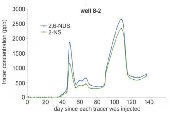 The surrounding production wells were sampled over the subsequent four years for tracer analysis by High-Performance Liquid Chromatography (HPLC) and fluorescence detection with detection limits of approximately 100 parts per trillion [68,69]. In order to separate matrix interferences from the tracer analytes, the samples were subjected to solid phase extraction prior to analysis. Decay kinetics studies have shown that all of the naphthalene sulfonate compounds used in this study are suitable for use in geothermal reservoirs having temperatures up to 250 °C, and a subset are suitable for use in reservoirs as hot as 300 °C [68,69,70,71,72].