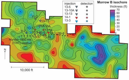 Although we have only a limited number of datapoints available, a well-to-well flow pattern can be recognized. Flow of the tracers is generally west to northwest, except for tracers injected into well 14-1, which were also detected toward the east of the injection well (Figure 12). Close inspection of the depth of the Morrow B reservoir in and between these well locations suggests that inter-well flow occurs between wells where the Morrow B is at the same depth, or in an up-dip direction; all wells where tracers were detected are up-dip from the injection wells. The Morrow B isochore map (Figure 12) shows that the Morrow B is of irregular thickness, and locally thins significantly just south of wells 13-17 and 13-19. The Morrow B deepens southward along an approximately EW-striking “step” (previously interpreted as fault #3 [64]), and drapes over the deeper Woodford and Hunton formations; the Hunton formation is locally eroded. It is possible that tracers injected north of the step (indicated with the dashed contour in Figure 12) in the Morrow B will not flow south of this step. If inter-well flow is horizontal or up-dip, the impermeable cap rock of the Morrow B (Thirteen Finger) would prohibit down-dip, or (generally) southeastward flow from the tracer injection wells, since the step in Morrow B depth is of the same magnitude as the thickness of the Morrow B.
