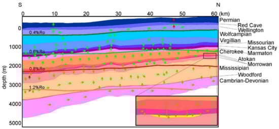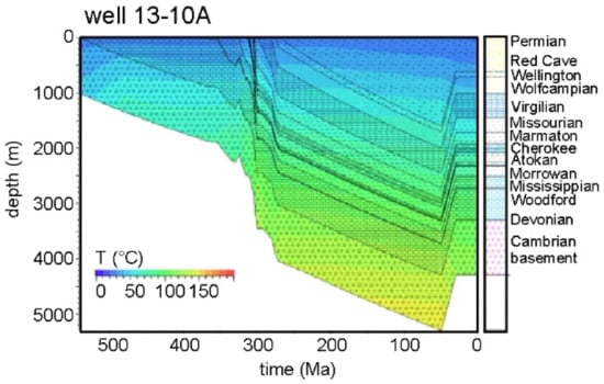 Geologic ages of the different formations (Table 2) are based on Higley et al. [62]. All lithologies were generalized based on the dominant lithology present within a model layer. Erosion amounts and timing for the pre-Pennsylvanian unconformity were based on interpretations of the unconformity being regional [21]. Well log data of well 13-10A did not reach basement depths because operators were not targeting intervals below the Morrowan Formation. In order to include the complete Anadarko Basin’s burial history, the modeled wells were extended to basement using 2D seismic data. The top of the basement in the seismic data has a distinctive seismic character change from sub-parallel laterally continuous reflectors to chaotic discontinuous reflectors. Basement depths were obtained by performing a seismic well-tie, and used a velocity model for the depth conversion, as described above. Once the seismic data were depth-converted, depth estimates for the Woodford Shale, Cambrian-Devonian, and basement were added to the one-dimensional and two-dimensional models. The Woodford Shale depth, thickness (40 ft), and initial TOC (~1.5–2%) were approximated from Higley et al. [62]