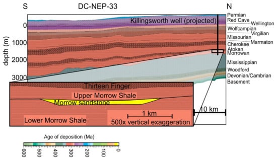 Overlying the Morrowan rocks is the Thirteen Finger formation belonging to the Atokan deposits (Early Pennsylvanian) that forms the seal of the CO2 reservoir. They consist of marine shales, sandstones and limestones [18] (Figure 3). The seal directly overlying the Morrowan sandstone reservoir is the Morrowan black shale. It formed as sea levels rose along the basin margins [40]. Both the Morrowan and Thirteen Finger black shales contain appreciable TOC values [24]. The lower and Upper Morrow shales and Thirteen Finger Limestone form, together with the Woodford Shale, the source rocks for the Morrow B reservoir (Section 5). Timing of maturation of these source rocks is discussed in Section 5 of this manuscript.