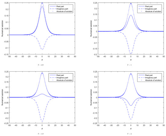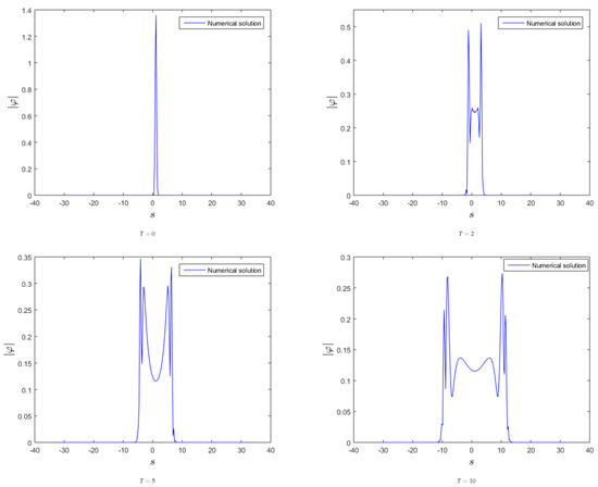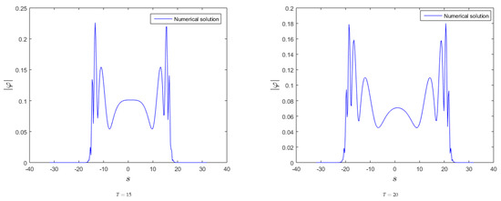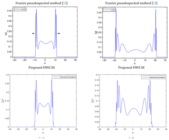 This problem is challenging due to the blow up phenomena of the soliton wave and has been considered in many papers as a practical problem [1,11,12] which has no exact solution. In Figure 3 the soliton wave is presented at different T, where the propagation of soliton is clearly seen as time increases. From this figure, one can examine that the soliton wave translates and converts into some lower waves quickly, and more ripples get up with the progression of wave. As the time , the single soliton is split into more than one small solitons and moves violently. In Table 2 and Table 3 the discrete conservation law are given for different T and by fixing M. From these table it can be easy to conclude that the HWCM can simulate the conservation of energy and mass in Equation (28) very well, respectively.