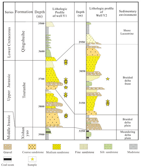 Twenty-three drilling core samples were derived from the Toutunhe Formation in the Kayindike area (Figure 1 and Figure 2). The sample wells are among the two important exploration wells and all drilling cores are from the braid river channels on the delta plain (Figure 2).