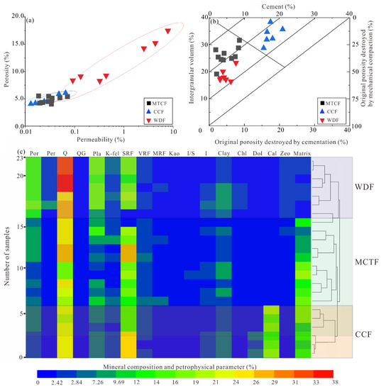 Due to the relatively low intensity of the diagenetic modification, the Toutunhe sandstone has relatively good physical properties, and a solid positive correlation exists between porosity and permeability (Figure 3a). However, some sandstone presents high contents of matrix and carbonate cement, which severely damages the original reservoir space. According to the diagenetic modification condition, the Toutunhe sandstone in the Kayindike area can be divided into three facies, namely carbonate-cemented facies (CCF), matrix-caused tightly-compacted facies (MTCF), and weakly diagenetically-reformed facies (WDF). The porosity and permeability of the weakly diagenetically-reformed facies are far better than those of the other facies, as indicated by the mineral composition heat map, physical property characteristics, and compaction–cementation chart (Figure 3).