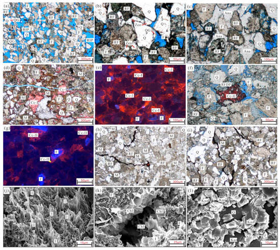 Casting thin sections of the tight sandstone samples in Toutunhe Formation, showing mainly diagenetic characteristics of 3 types of lithofacies. (a) weakly diagenetic reformed facies, residual intergranular pores widely developed with weakly dissolved, 3643.2 m, Y1 well, plane-polarized light; (b) weakly diagenetic reformed facies, analcime filled in residual intergranular pore, 3643.2 m, Y1 well, plane-polarized light; (c) poikilitic analcime filling in residual intergranular pores, 3907.4 m, Y1 well, plane-polarized light; (d) carbonate cemented facies, poikilitic calcite filling the residual intergranular pores, cut by fractures, 3809.5 m, Y1 well, plane-polarized light; (e) carbonate cemented facies, poikilitic calcite emitting bright orange fluorescence, 3809.5 m, Y1 well, cathodoluminescence image; (f) carbonate cemented facies, ferrocalcite occluding the dissolution pore of rock fragment, 3182.3 m, well Y2, plane-polarized light; (g) ferrocalcite emits dark orange fluorescence, 3809.8 m, well Y1, cathodoluminescence image; (h) matrix with a widely developed but small proportion of residual intergranular pores, most of micro-fractures were filled with bitumen, 3182 m, well Y2, plane-polarized light; (i) pore-filling matrix widely developed, most of micro-fractures were filled with bitumen, 3181 m, well Y2, plane-polarized light; (j) fibrous illite developed on the mineral grain, 3709 m, Y1 well, SEM; (k) Lining-blade shape chlorite, 3809.1 m, Y1 well, SEM; (l) kaolinite aggregates in book-page shape filled primary pores, 3643.2 m, well X1, SEM. Q: quartz; QG: quartz overgrowth; F: feldspar; MRF: metamorphic rock fragment; VRF: volcanic rock fragment; SRF: sedimentary rock fragment; RF: rock fragment; Cal-I: calcite; Cal-II: ferrocalcite; Sid: siderite; C: chlorite; Kao: kaolinite; I: illite; Zeo: zeolite; M: matrix; RIP: residual inter-granular pore; MP: matrix pores: FDP: feldspar dissolution pores; RFDP: rock fragment dissolution pores; IPC: intercrystalline pores of clay; CIP: clay mineral intergranular pore.