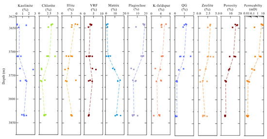 The vertical distribution of mineral composition and petrophysical property in the Toutunhe Formation sandstone. VRF: volcanic rock fragment; QG: quartz overgrowth.