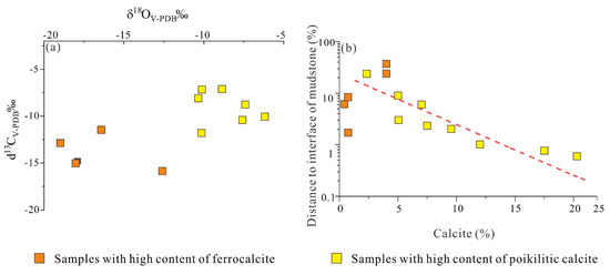 Features of carbon–oxygen stable isotopes for carbonate cements (a) and the relationship between the carbonate cement and the distance to mudstone/sandstone interface in Toutunhe formation sandstones (b).