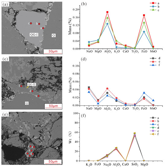 In situ microprobe analysis for quartz and zeolite in the Toutunhe Formation sandstone. (a) Backscattered electron image exhibiting experimental point situations of quartz for the sample 3643.2 m, well X1; (b) elemental composition distribution features of a quartz grain in sample 3643.2 m, well X1; (c) backscattered electron image exhibiting experimental point situations of quartz for the sample 3907.4 m, well X1; (d) elemental composition distribution characteristics of a quartz grain in sample 3907.4 m, well X1; (e) backscattered electron image exhibiting experimental point situations of zeolite for the sample 3710 m, well X1; (f) elemental composition distribution features of a zeolite grain in sample 3710 m, well X1.