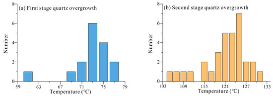 Frequency histogram of homogenization temperature from inclusions in authigenic quartz cements of the Toutunhe Formation sandstone. (a) Homogenization temperature of the first stage quartz overgrowth; (b) homogenization temperature of the second stage quartz overgrowth.