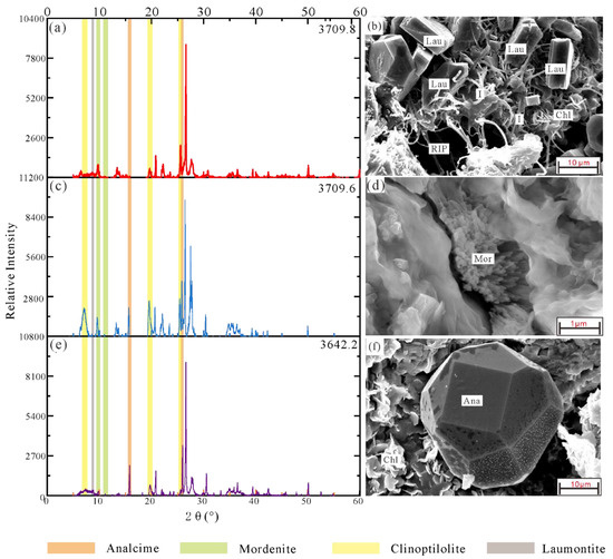 XRD patterns and micrographs of representative samples with various kinds of zeolite in the Toutunhe Formation sandstone reservoir. (a) XRD pattern of sample 3709.8 m, whole-rock analysis, X1 well; (b) columnar laumontite widely dispersed in residual intergranular pores, 3709.8 m, X1 well; (c) XRD pattern of sample, 3709.6 m, whole-rock analysis, X1 well; (d) fibrous mordenite developed in the residual intergranular pores, 3709.6 m, X1 well; (e) XRD pattern of sample 3643.2 m, whole-rock analysis, X1 well; (f) euhedral analcime crystal developed on the detrital quartz grain, 3643.2 m, X1 well.