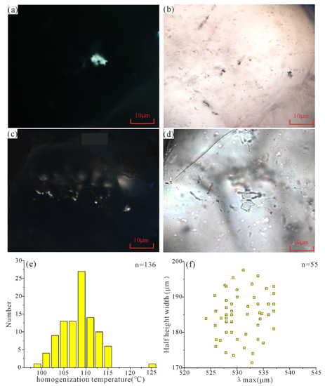 Micrographs of oil inclusions of the sandstone reservoirs in the Toutunhe Formation. Yellow fluorescent oil inclusions trapped in a quartz crack, (a) transmission light and (b) fluorescent light, 3709.4 m, Y1 well; yellow fluorescent oil inclusions trapped in healed microfractures developed in a detrital quartz grain, (c) transmission light and (d) fluorescent light, 3642.2 m, Y1 well; histogram of homogenization temperatures of aqueous inclusions corresponding to oil inclusions in the same oil-aqueous inclusion pairs (e); Scatter of half height width and λmax of fluorescence in oil inclusion (f).