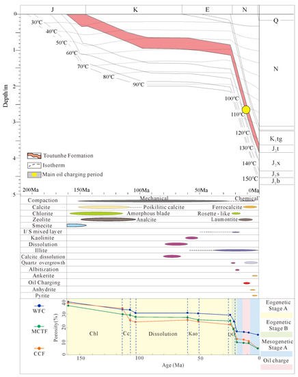 Here in this section, we discussed the temporal sequence of sandstone densification and hydrocarbon emplacement, based on the identified hydrocarbon emplacement time and the above analysis of the main diagenetic events and their mechanisms of the Toutunhe tight sandstone.
