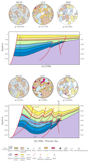 The pore evolution models of the CCF, the MTCF, and the WDF was developed in this research via the pore evolution reconstruction method proposed by Dou ([64]; Figure 11). The pore evolution process was described in detail in Table 3. The carbonate cemented facies was mainly characterized by the relatively high content of calcite, ferrocalcite, ferrodolomite, and matrix. For example, Sample 3809.8 had original porosity of 38%, which was subjected to compaction-caused loss of 18.1%. The eogenetic calcite cementation led to the most porosity reduction, while it to some extent enhanced the compaction resistance of the sandstone reservoir, which resulted in the compaction-related porosity loss smaller than that of the MTCF. The mesogenetic ferrocalcite and ferrodolomite cementation led to porosity loss of about 4%, and the porosity of the carbonate cemented facies had dropped to 10% since 9 Ma, which represented densification of the sandstone reservoir (Table 3).