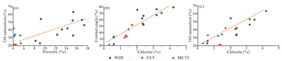 Wettability alteration, mainly triggered by the change of Zeta-potential on the mineral surface, had vital effects on the hydrocarbon emplacement in tight sandstone [69]. The surface of crude oil was often with negative potential [69]. Thus, if the authigenic mineral surface had positive potential, the oil and mineral would attract each other, which was manifested as lipophilicity [48]. By measuring the contact angle of 18 representative samples of the three facies and oil saturations of the 18 Jurassic sandstone samples of the Kayindike area, this research investigated the effects of diagenetic minerals on the reservoir wettability of the Jurassic reservoir in the South Junggar (Figure 13b,c). The measured contact angles are 13.5° to 79.52°. Moreover, the contact angles of the WDF were 66.24° to 79.52° (fairly lipophilic), considerably higher than those of the other facies averaging 27.41° (highly hydrophilic).