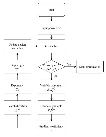 The VSCGM is the most updated version of the simplified conjugate gradient method (SCGM), where the design-variable increments and the step lengths in the VSCGM are automatically adjusted to favor the optimization process. Consequently, the VSCGM requires fewer optimization iterations than the SCGM [28]. Design-variable increment depends on the initial increment in design variable , initial step length , and previous step length as follows: