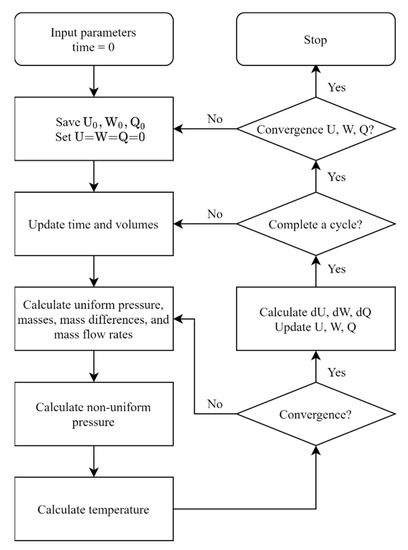 In the modified thermodynamic model, proposed by Cheng and Phung [17], pressure losses are directly introduced into the energy equation, so heat transfer rates and indicated power meet the energy balance at the final cycle. This builds a solid foundation for multi-goal optimization based on these two parameters, as mentioned in Section 3.1. The main calculations of the modified thermodynamic model can be summarized as follows: