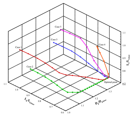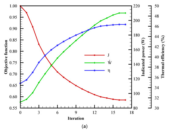 Figure 4a shows that the optimization process terminates after 17 iterations for the baseline case. The value of the objective function goes down monotonically from 1 to 0.5856. The indicated power progressively raises from 88.2 to 210.2 W and the thermal efficiency increases from 34.8 to 46.4%.