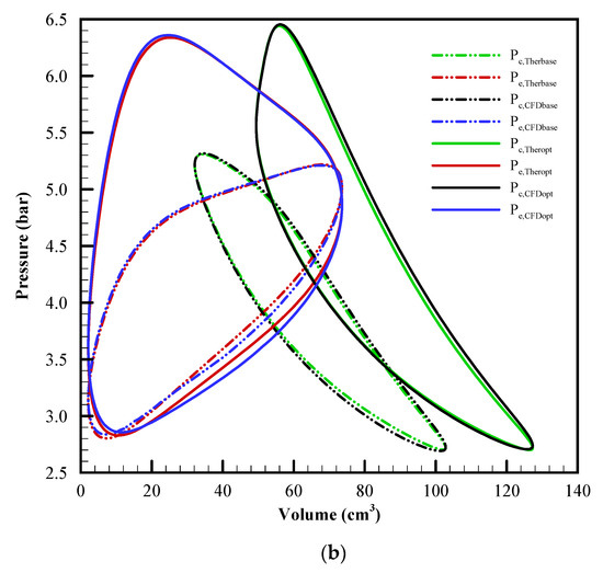 Figure 4b shows the CFD model and the VSCGM optimizer generate well-matched P-V curves before and after the optimization process. Additionally, it should be noted that there is a significant enlargement of the P-V area at the end of the optimization process in comparison to that at the beginning. This can be explained as follows. During the optimization iteration, a gradual increase in piston diameter, causing the right shift of the compression-chamber P-V area, enhances not only the swept volume but the compression ratio. It leads to an increase in pressure during the expansion process and the resulting indicated power. Moreover, it elevates the Reynolds number, so the heat transfer becomes more effective and the temperature of working gas becomes closer to wall temperatures. It also explains the fact that the thermal efficiency increases monotonically, as seen in Figure 4a.