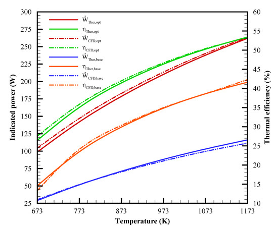 Figure 6 indicates the effect of heating temperature on the optimal solution obtained from the VSCGM optimizer. The heating temperature varying from 673 to 1173 K is considered. Before optimization, the comparison between the modified thermodynamic model with values of unknown coefficients in Table 3 and the CFD simulation obtained from the reference [18] is performed. The engine performance run by the two models is in good agreement. From the modified thermodynamic model, the original indicated power varies monotonically from 29.1 to 116.1 W and the original thermal efficiency does from 14.6 to 41.6%. After optimization, the optimal indicated power is raised from 98.7 W to 262.0 W and the optimal thermal efficiency is from 26.4 to 53.4% over this range of heating temperature. From classical thermodynamics, a rise in heating temperature raises engine performance. It explains why the increase in heating temperature has a positive effect on optimal engine performance. To doubly check the results from the VSCGM optimizer, CFD simulation cases are performed with the optimal configuration specifications obtained from the VSCGM optimizer. The CFD results agree well with those from the VSCGM optimizer. The maximum difference in the indicated power between the two models is 5.5 W, while the maximum difference in the thermal efficiency is only 1.1%.