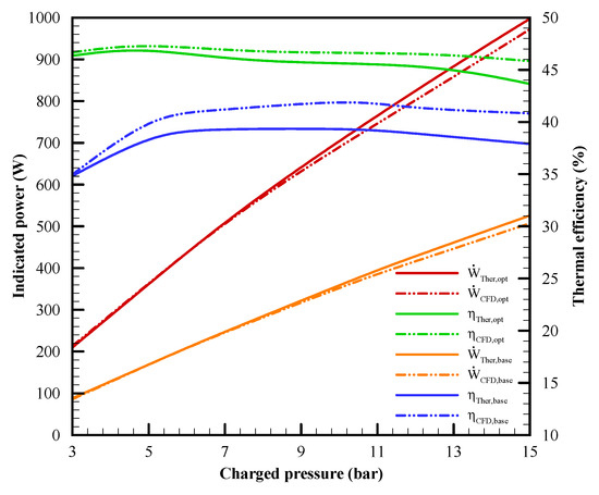 - The optimal thermal efficiency decreases slightly from 46.4 to 43.7%, while the optimal indicated power raises from 210.2 to 997.5 W as the charged pressure varies from 3 to 15 bar. The double-check from the CFD model shows that the case of 15-bar charged pressure gives the maximum difference between the CFD model and the VSCGM optimizer. These maximum differences are 2.2% for the optimal thermal efficiency and 25.2 W for the optimal indicated power.