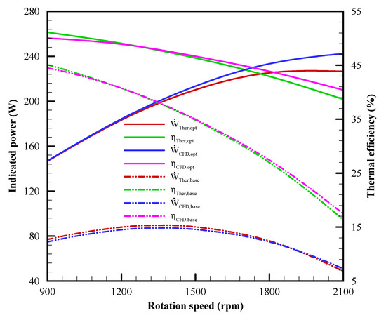 - The optimal thermal efficiency goes down from 51.1 to 38.7% and the optimal indicated power surges from 146.7 to 226.6 W as the rotation speed increases from 900 to 2100 rpm. The comparison shows that the maximum difference in the optimal indicated power is 15.9 W, while that in the optimal thermal efficiency is 1.7% at 2100 rpm between the CFD model and the VSCGM optimizer.
