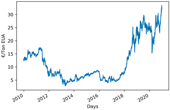 The evolution of EUA prices has complicated the current economic situation, as their sharp rise has affected the costs of various sectors, causing significant increases in electricity prices. For example, the wholesale electricity market prices in Spain in September 2021 are three times higher than the year before. Although the cost of EUAs is not the only factor responsible for this price increase, according to some estimates [9], in the case of Spain, around 20% of this increase would be related to the rise of CO2 prices in the EU ETS. Other European markets have experienced an evolution of wholesale electricity prices very similar to the Spanish one. In this way, the energy price increase in Europe has become macroeconomically significant [10]. Several factors, in addition to the CO2 rising trend, are responsible for the rise of electricity prices: an increase of natural gas demand forced by higher demand of electric energy along with a decrease in renewable electricity production and a significant increase in coal prices. The pricing system in European (and other) electricity markets assumes that the price of electricity reflects the marginal production cost of the most expensive technology involved in generation. Therefore, fossil fuel power producers incorporate the price of EUAs into the marginal cost, passing on CO2 prices into electricity prices and, where appropriate, incentivizing investment in renewable sources. The maintenance of high EUAs prices, although may be compatible with the environmental objective of the system and reinforce the incentives for decarbonization, can also lead to problems derived from the increase in costs in all sectors, including the loss of commercial competitiveness in Europe. In addition, the effects of higher electricity prices on consumers can be very significant, affecting different social classes in different ways. Therefore, prediction of the time evolution of EUA prices has become a fundamental tool for enterprises dealing with them, both for the short-term, to manage their day-to-day evolution—linked to its behavior as a financial asset—and the long-term, related to investments and decisions aimed at reducing the emission of greenhouse gases.