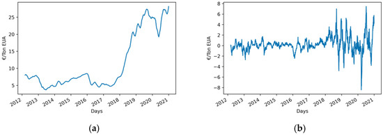 The first preprocessing method consists of splitting the CO2 emission allowance price series into two subseries (Figure 2): its trend and fluctuations around it. They both will be independently forecasted, and their predictions added to obtain the predicted price.