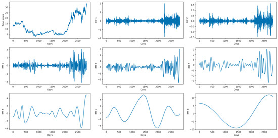 In the second preprocessing model, the times series is split into eight stationary subseries (Figure 3), IMFs, which are independently forecasted and then added.