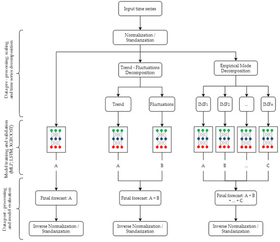 Before preprocessing the dataset, it has been scaled with both Min-Max normalization and standardization. The whole sequence of the different actions carried out to perform forecasting is described in the flowchart presented in Figure 4. As it may be seen, the process starts by scaling data and then splitting them into trend-fluctuations or IMF subseries, which are independently forecasted by each model. The predictions obtained are added to obtain the price predictions after rescaling the values provided by those summations. When data are not split, they are directly processed after scaled. This process is the same for both training and validation.