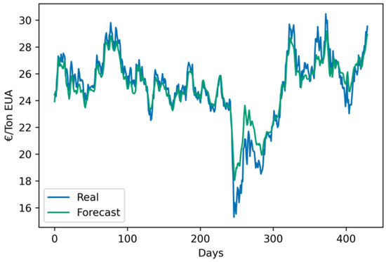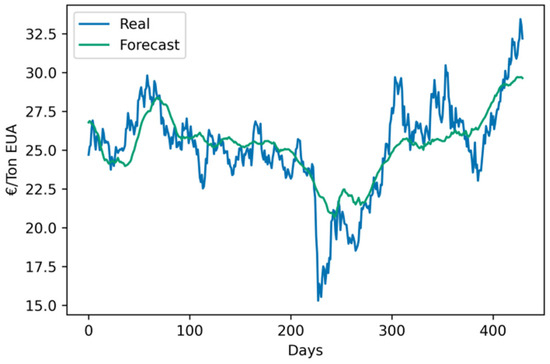 On the other hand, it may be very interesting to analyze the evolution of predictions regarding their time horizon in order to identify how they behave, and their accuracies evolve. To do that, the one-day-ahead and the twenty-days-ahead predictions obtained in the validation set of the whole dataset provided by MLP-EMD are presented in Figure 5 and Figure 6. It may be seen in Figure 5 that one-day-ahead predictions are able to follow fluctuations of CO2 price, providing a reliable estimation of its daily evolution. Nevertheless, predictions with a time horizon of 20 days, as seen in Figure 6, are not able to follow daily fluctuations but, instead, they represent a sort of mean value of fluctuating prices, in other words, they provide a sort of trend of the time evolution of CO2 prices. So, it could be stated that the model provides a prediction of the trend of the price evolution for the long-term instead of an estimation of actual prices on that time horizon. This behavior may be very useful for traders interested in the long-term evolution of prices because those predictions describe a sort of trend of how they will evolve.