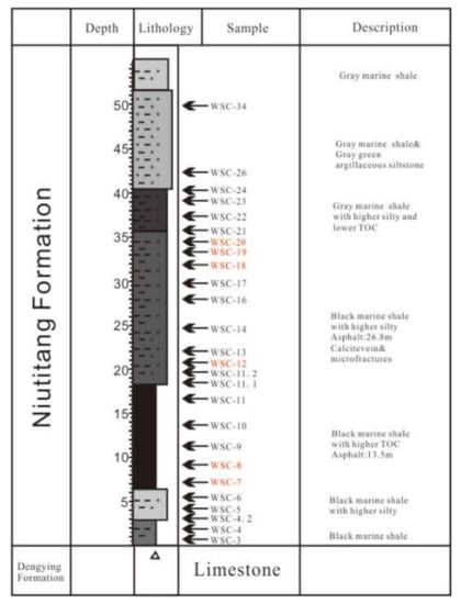 The column chart of sampled lithology in Wenshuicun section, Guizhou province. (Notice: the sample marked red is the sample used in this experiment.)