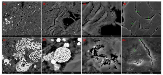 According to the experimental results, it was found that inorganic pores are commonly developed in the black shale samples of the Wenshuicun region, including clay mineral shrinkage fractures and dissolution pores, and pyrite intercrystalline pores. The pore size was nanometer-level; some cracks were only about 20 nm, while large dissolution pores and cracks could reach several microns, but most of them were between hundreds of nanometers, and the cracks developed into complex fracture networks. Pyrite was more developed, with the development of berrylike pyrite and single crystal pyrite, mostly of triangular, square and irregular shapes. Microscopically, large amounts of organic matter could be observed to be filled with pyrite or developed in association with clay minerals, but organic pores were hardly developed (Figure 2).