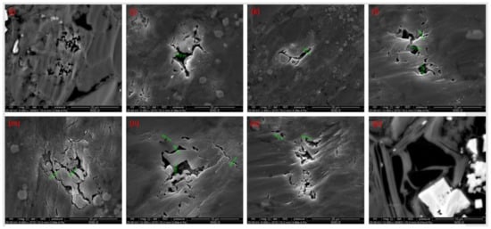 As the degree of thermal evolution increases, the chemical composition and structure of kerogen will also change constantly, forming carbonaceous residues and eventually transforming into graphite [26]. This process is called carbonization. Zhang et al. (2017) [45] pointed out that the maturity threshold for the carbonization of organic matter was 3.2%. At the same percentage, organic pores collapsed and decreased under compaction, reducing shale porosity. After measurement, the shale bitumen reflectance of the Niutitang formation was about 3.9%, and the reduced vitrinite reflectance was also above 2.8%, which indicates that it belongs to the over-mature stage. Combined with the above observation results, no organic matter pores were found in the shale in this region, indicating that, due to the over maturity of the shale, carbonization has occurred, resulting in the change of shale microstructure and the deformation and collapse of organic pores. Meanwhile, under the action of confining pressure and compaction, organic pores were further destroyed and eventually died out. This is consistent with the research results of some foreign scholars [46].