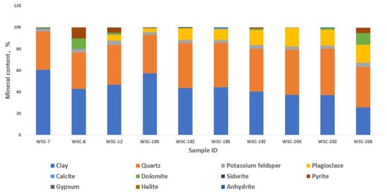 The mineral composition and clay mineral composition of shale samples were observed and analyzed by X-ray diffraction. According to the results of the experiment, the mineral components of Wenshuicun’s lower Cambrian black cattle hoof pond group shale are complex, containing detrital minerals, such as quartz, potash feldspar, plagioclase and so on. The carbonate minerals include calcite, dolomite and siderite, etc. Pyrite and a small amount of gypsum, anhydrite and halite and other amorphous minerals could be seen in some samples. At the same time, the clay minerals contained illite, kaolinite and an illite–smectite mixed layer, but no smectite, indicating that the smectite had been completely transformed into illite, and the proportion of the smectite layer in the I/S mixed layer is zero, meaning that it belonged to the late diagenetic stage. In WSC-20Z, a 1.59% chlorite–kaolinite mixed layer was found, but not in other samples. The shale was dominated by clay minerals, the content of which ranged from 25.82% to 60.77%, with an average of 43.68%. Quartz was second, with an average of 38.57%, ranging from 33.81% to 42.79% (Table 1 and Figure 4). Illite was the main clay mineral, the content of which ranged from 39.02% to 82.17%, with an average of 67.35%. The second was the illite-smectite mixed layer, with an average content of 23.69%.