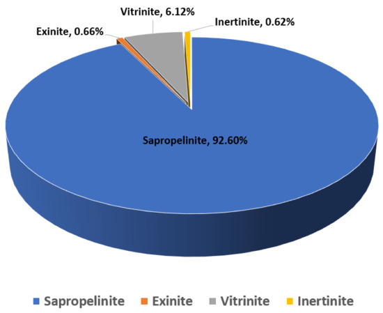 According to the results of kerogen macerals, it was found that the black shale of the lower Cambrian Niutitang formation was mainly composed of sapropelinite, accounting for 92.60%, followed by vitrinite, accounting for 6.12%. The contents of exinite and inertinite were very small, accounting for only 0.66% and 0.62% (Figure 5). In sapropelinite, the sapropelic amorphous body was the main component, and no other submicroscopic components were found. The normal vitrinite was dominant in vitrinite, and a small amount of hydrogen-rich vitrinite was found in some samples. Only a few samples of cutinite and mycetome were found in some samples of chitin, and no other components were found. Inertinite contained only a small amount of fusinite (Table 4). The shale kerogen in this section belonged to type Ⅰ kerogen by hydrogen-like index calculation.