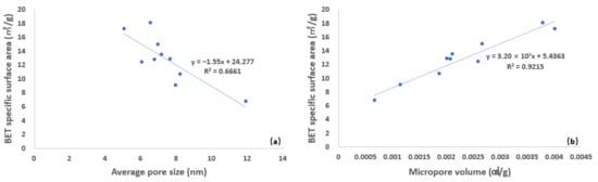 Relationship between BET-specific surface area and pores; (a) the cross plot of BET-specific surface area and the average pore size; (b) the cross plot of BET-specific surface area and the micropore volume.