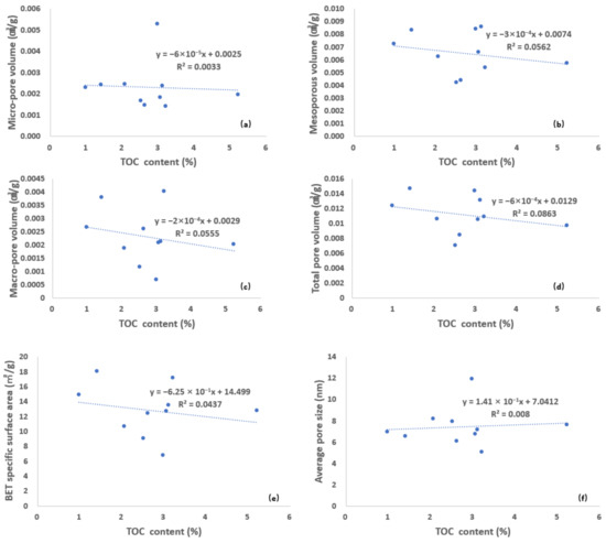 Relationship between microscopic pores and TOC content of lower Cambrian black shale from the Niutitang formation in Wenshuicun, Guizhou province; (a) the cross plot of micropore volume and the TOC content; (b) the cross plot of mesopore volume and the TOC content; (c) the cross plot of Macropore volume and the TOC content; (d) the cross plot of total pore volume and the TOC content; (e) the cross plot of BET specific surface area and the TOC content; (f) the cross plot of average pore size and the TOC content.