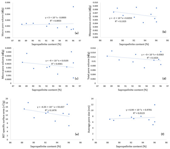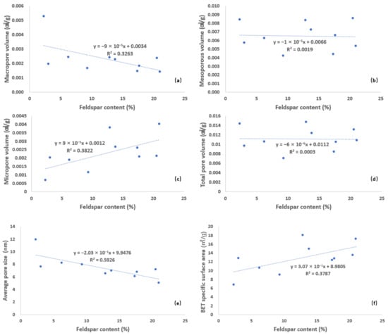 There was a good negative correlation between feldspar content and macropore volume, and average pore size, with correlation coefficients being 0.3263 and 0.5926, respectively (Figure 11a,e). However, there was a good positive correlation with micropore volume. The correlation coefficient was 0.3822 (Figure 11c). Meanwhile, it showed a good positive correlation with BET-specific surface area (R2 = 0.3787) (Figure 11f). But there was a weak negative correlation or no correlation with mesopore volume and total pore volume (Figure 11b,d). With the increase of feldspar content, the volume of large nano-pores became smaller and smaller, while the volume of micropores below 5 nm increased. Therefore, feldspar content also had an effect on the development of microscopic pores in shale in this region.