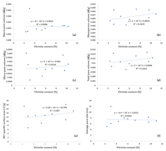 The development of organic pores is influenced by maceral [42]. Cao et al. (2018) [15] found, in combination with the previous research results, that vitrinite and solid bitumen were not the main contributors to the development of organic pores in the high maturity stage, while sapropelinite was the most favorable component for the development of organic pores. Long et al. (2012) [35] also found that sapropelinite was favorable for pore development and was the most likely to form pores. However, they also concluded that vitinite had a strong hydrocarbon generation capacity and that abnormal pressure generated in the thermal evolution process would rupture organic matter and form pores. For example, micro-pores and mesopores are developed in the matrix vitrinite, and macro-pores are developed in the lumen of the fusinite of remaining plant tissues [43]. Jiang et al. (2021) [44] found that the maceral difference of organic matter plays an important role in controlling the pore development of continental shale reservoir, and high saprophytic content (>60%) is the guarantor of superior reservoir capacity. Similarly, in this study, a scatter plot was used to establish the correlation between different macerals and microscopic pores. Our analysis shows that the sapropelinite in kerogen macerals was weakly correlated with mesoporous volume, total pore volume and BET-specific surface area, and the correlation coefficients were R2 = 0.1325, R2 = 0.1023, R2 = 0.1476. The correlation is not obvious or non-existent with other types of pores (Figure 8); there is a weak correlation between vitrinite and mesoporous volume and total pore volume (R2 = 0.1623 and R2 = 0.1024), but there is no obvious correlation or no correlation between vitrinite and other types of pore size (Figure 9). Due to the low content of exinite and inertinite, the reference value is not ideal, and analysis and evaluation were not completed.