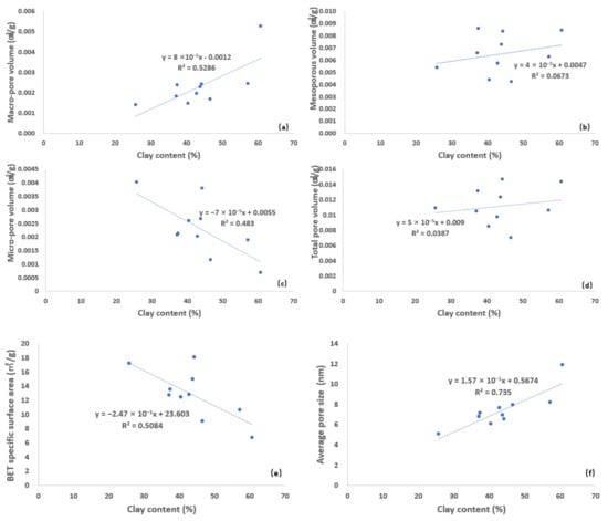 Through the scatter plot, the correlation between microscopic pores (such as micropores, mesophores, macropores, total pore volumes, BET-specific surface area and average pore size) and different minerals was established. It was found that the clay mineral content of the lower Cambrian Niutitang formation black shale had an obviously positive correlation with macropore volume and average pore size; correlation coefficients are 0.5286 and 0.735 (Figure 10a,f), respectively. There was a good negative correlation between micropore volume and BET-specific surface area (R2 = 0.483 and R2 = 0.5084 respectively) (Figure 10c,e). The correlation between mesoporous volume and total pore volume was weak or non-existent (Figure 10b,d). The above evidence indicates that the content of clay minerals was the main controlling factor for the development of microscopic pores in shale in this region. With the increase of clay mineral content, the micro-pore volume became smaller and smaller, while the larger pore volume above 25 nm became larger and larger.