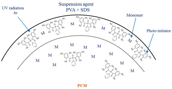 Suspension polymerization using UV radiation benefits primarily from the possibility of being performed at low temperatures and thus can be used to encapsulate heat-sensitive PCMs. A schematic representation of the suspension polymerization using UV radiation is illustrated in Figure 1. The affinity for water between monomers and PCM during emulsion preparation plays a significant role for diffusing most of the monomers towards the PCM/water interface, and this leads to PCM droplets and micelles enriched with monomers. With UV radiation, the photoinitiator initiates crosslinking of monomers to form polymers, making the shell that encapsulates the PCM. On other hand, the polarity, interfacial tension and molecular weight of the repeat unit of the formed chain polymer within the PCM droplets are crucial for forming spherical PCM microcapsules with complete polymer shell coverage. However, one of the limitations of UV radiation is its limited penetration depth through opaque liquids, making it difficult to transmit far through suspensions. Thus, the optimum design of the UV reactor is vital in increasing conversion of monomers to polymers.